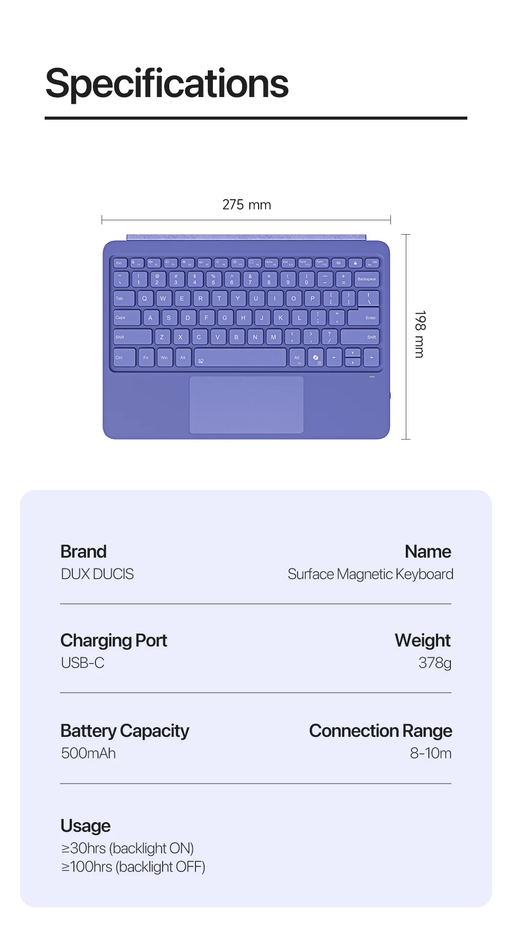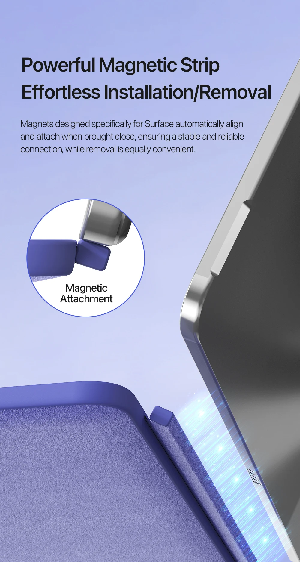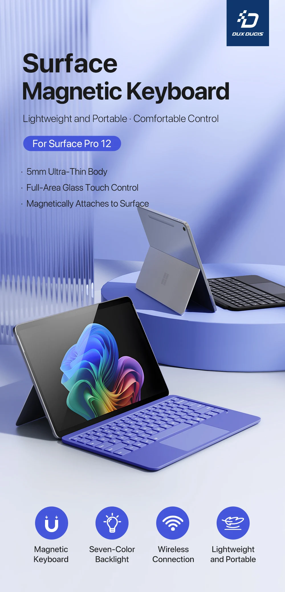 The magnetic connection ensures quick attachment and stable use, while the lightweight design makes it ideal for travel or mobile work setups. Built with durable materials and a matte finish, this keyboard combines elegance, comfort, and reliability in one compact form.